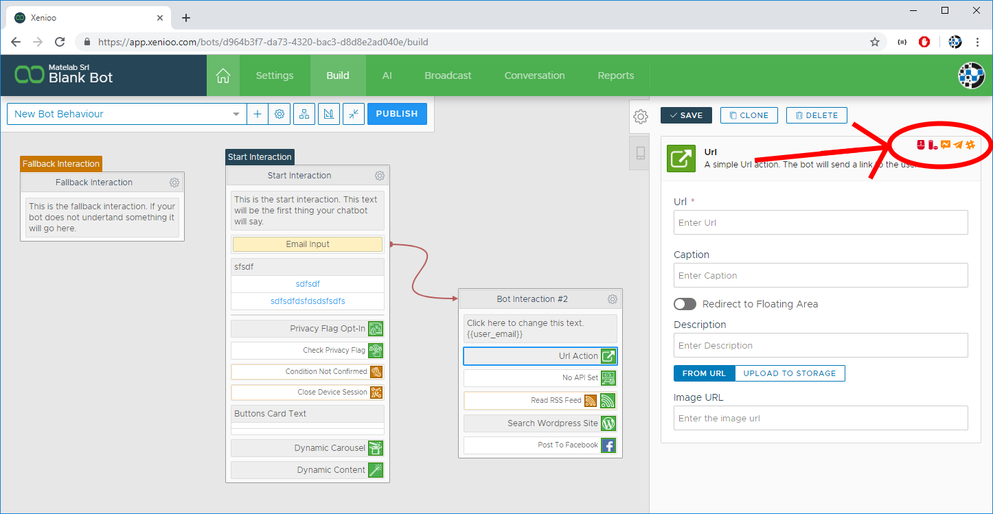When creating your chatbot some of the action you use will display Platform Quick Tips. These color-coded tips will give you a quick head-up on how the action may behave or work on a specific platform. Just over the mouse on a platform icon to get informations on visualization support or specific constraints.