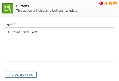 This action will display a standard buttons card. A buttons card is card with a text followed by a variable number of buttons that can lead to external websites or postback to the chatbot.
