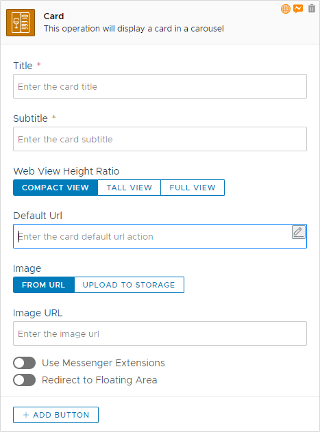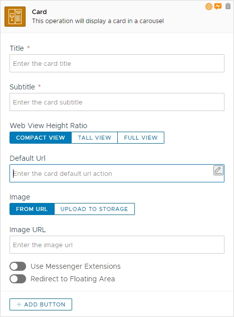 This operation will add a new card in a carousel template. Each card can have text, an image, multiple buttons and a default URL.