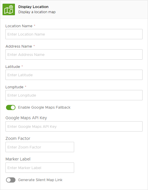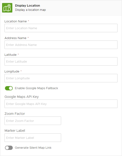 If location content is not supported by the channel and no Google Maps Static API configuration is supplied, this action will try to display a link button redirecting to Google Maps for the supplied location name and address.