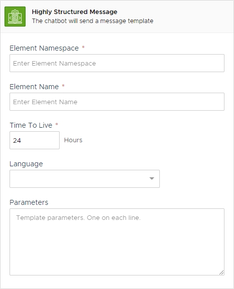 The Highly Structured Message action will deliver a WhatsApp Business template in full accordance to Facebook API. Please also refer to Facebook documents for specific information on the required fields.