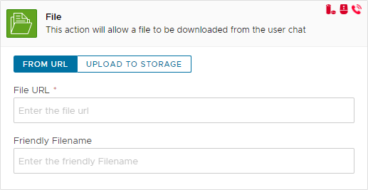 This action will attach a generic file to the conversation that the user can download. You can add a file as an external URL or upload it to MyLINK Connect storage.