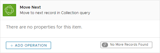 This action will move the current query cursor to the next available record. If no query has been executed before calling this action, execution will be ignored. The flow of a complete loop on multiple records may look similar to this: