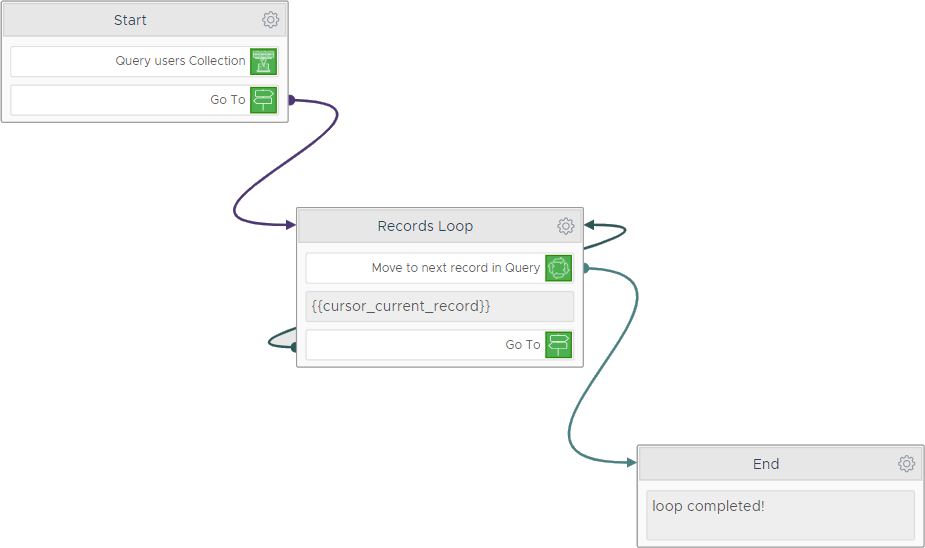 This action does not directly extract any data but instead create a record cursor that can extract a single record on each read using a Move To Next Record action. The flow of a complete loop on multiple records may look similar to this: