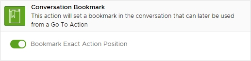 This action sets a bookmark to a conversation Behavior and Interaction that can later be used by a Go To Action. if the Bookmark Exact Action Position flag is enabled, the Go To Action will set the flow position at the action immediately following the bookmark position.