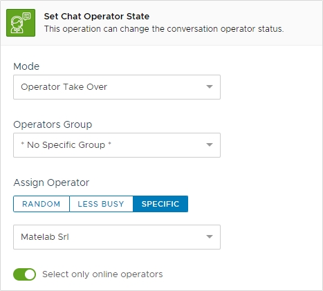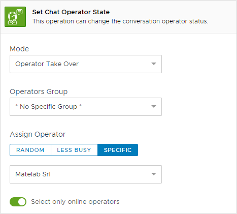 If no operator is available and the Select only online operators flag is enabled, no action will be taken and the chat state will not change.