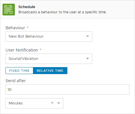 This action will broadcast a specified behaviour to the user at a specific time or after a delay. The result will be automatically scheduled by Xenioo and sent to the user at the correct time.