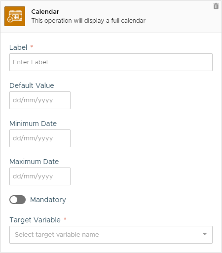 This operation will add a full page calendar to the current Form Container action. The full page calendar allows the user to select a date by clicking on the desired date.