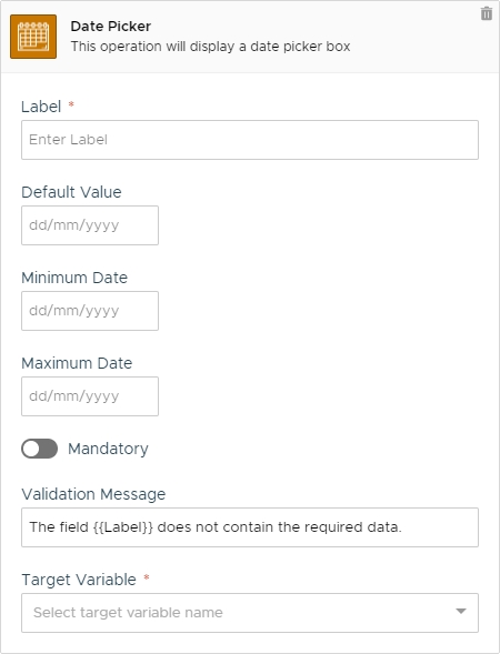 This operation will add a Date picker field to the current Form Container action. The date picker will let the user quickly choose a date by selecting it from a dropdown calendar widget.