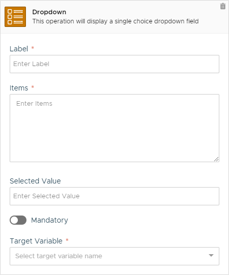 This operation will add a dropdown box to the current Form Container action. The field will allow the user to select a value from a list of possible values.