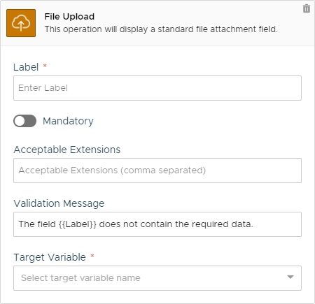 This operation will add file upload field to the current Form Container action. An upload field will allow the user to attach a file to your form. If you would like to ask your contact to attach a file directly from the channel, check out the Media Attachment Action.