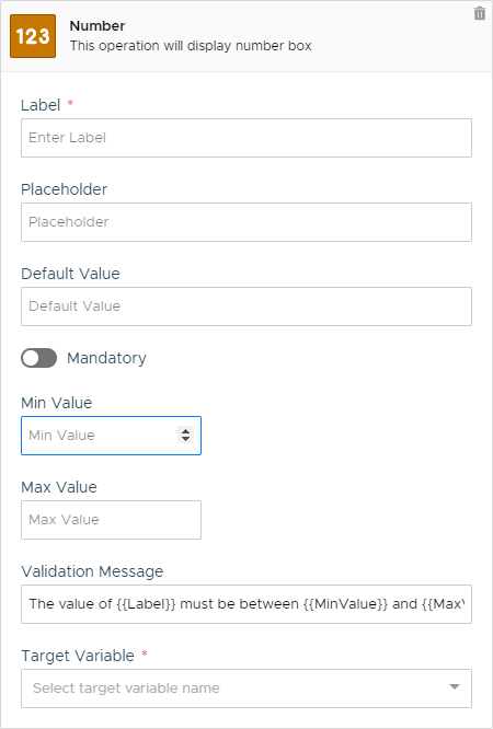This operation will add a numeric text box to the current Form Container action. A numeric text box will accept only numbers and usually display up/down arrows to increase and decrease the value.