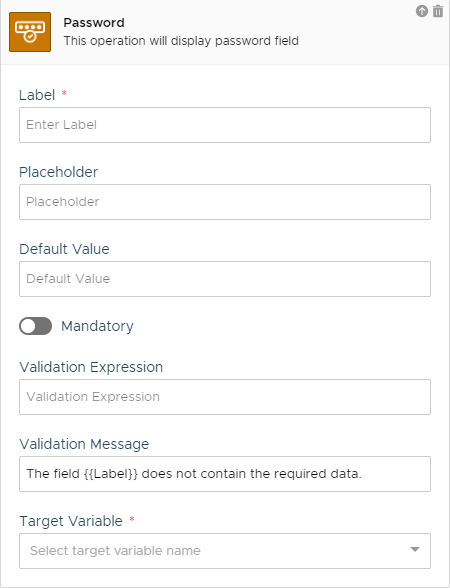 This operation will add a password text box to the current Form Container action. A password text box will not display the characters typed by the user.