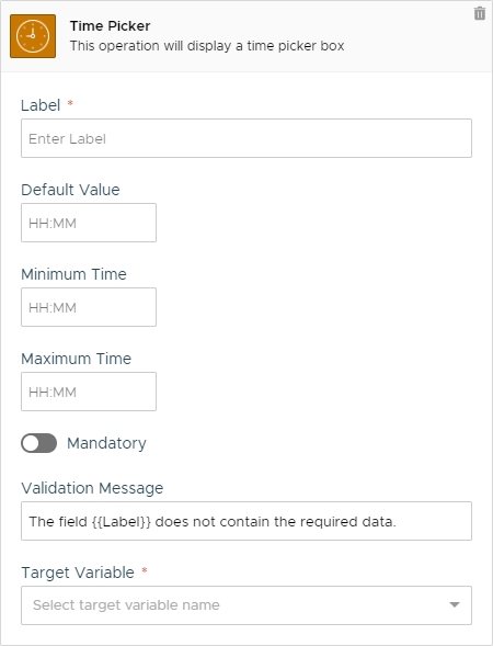 This operation will add a Time picker field to the current Form Container action. The time picker will let the user quickly choose a time by using sliders buttons.
