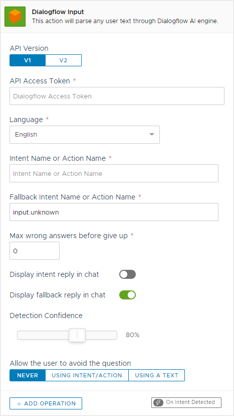 On Intent Detected. This action will trigger any child operation as soon as the user input is matching the selected intent with at least the specified confidence.