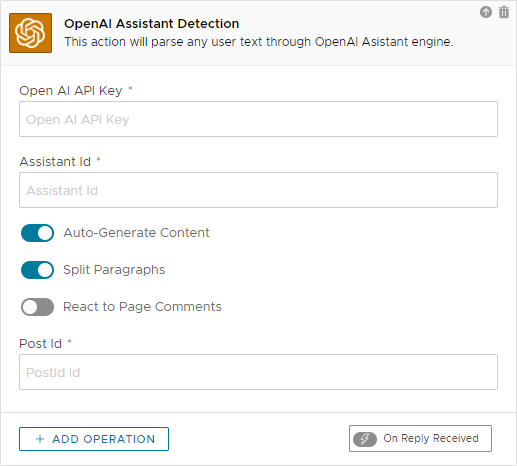 On Reply Received. This action will trigger any child operation as soon as the result is available. This trigger will not be executed if the "Auto-Generate Content" flag is enabled.