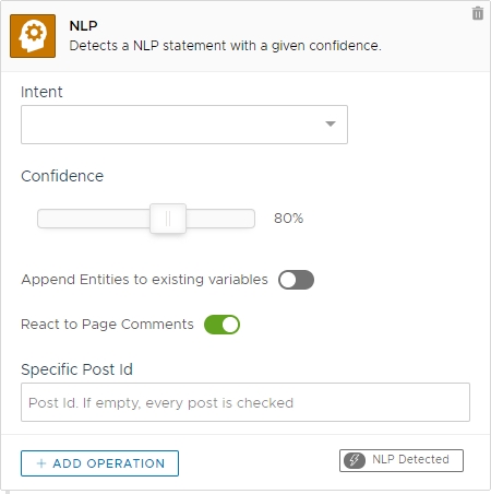 NLP Detected. This action will trigger any child operation as soon as the user input is matching the selected intent with at least the specified confidence.