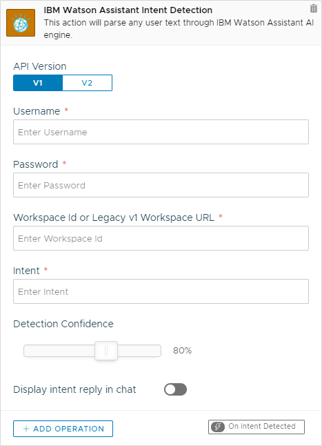 On Intent Detected. This action will trigger any child operation as soon as the user input is matching the selected intent with at least the specified confidence.