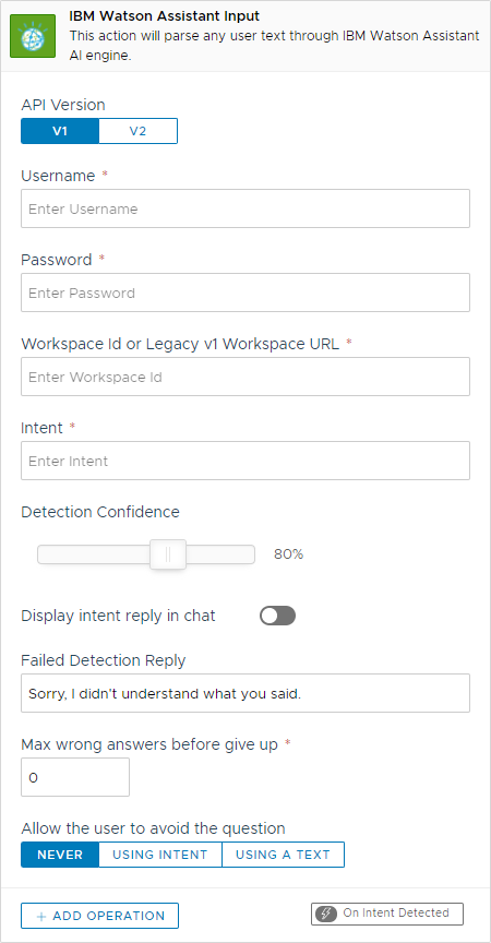 On Intent Detected. This action will trigger any child operation as soon as the user input is matching the selected intent with at least the specified confidence.