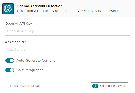 | Auto-Generate Content | If enabled, MyLINK Connect will generate the bubble with the content of the assistant reply   | :no\_entry:                                                                     |
