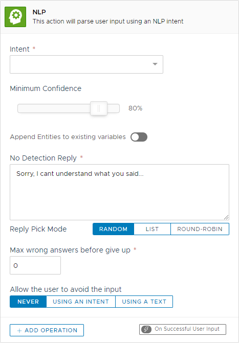 This action will hold the conversation and validate user input against a MyLINK Connect NLP Intent. The conversation will hold until the intent is detected with enough confidence or if the user, when allowed, skips the question.
