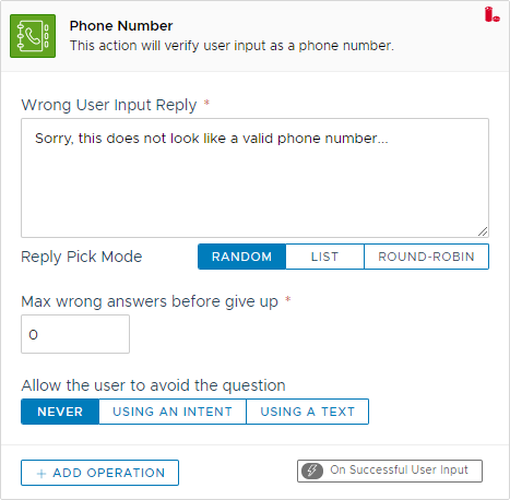 This action will hold the conversation and wait for the user to input a phone number. The conversation will hold until the user inputs a correct phone number or if the user, when allowed, skips the question.