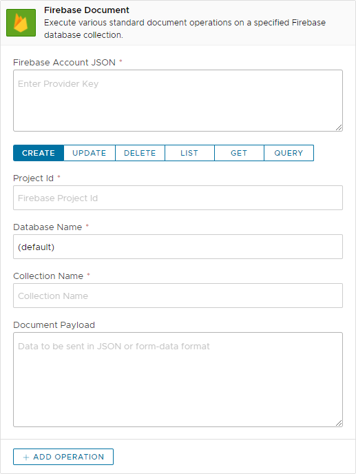 Use this action to insert, update, delete or retrieve one or more Firebase cloud documents from your Firebase account.