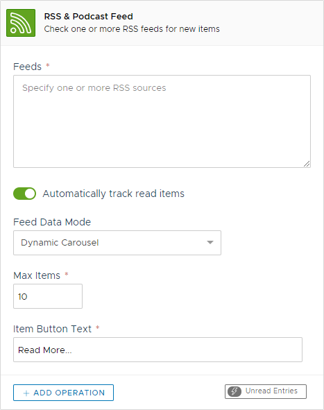 When using multiple feed sources and Single Feed Variables mode, only the first unread item will be returned. When using Dynamic Carousel mode or Data Model mode all feeds will be evaluated until Max Items value is reached.
