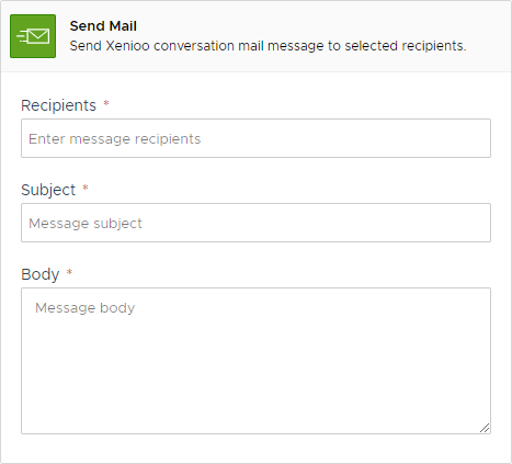 This action will send a Connect mail message to one or more recipients containing variables, tags and chat status. Can be used as an alert or for mailing integrations.
