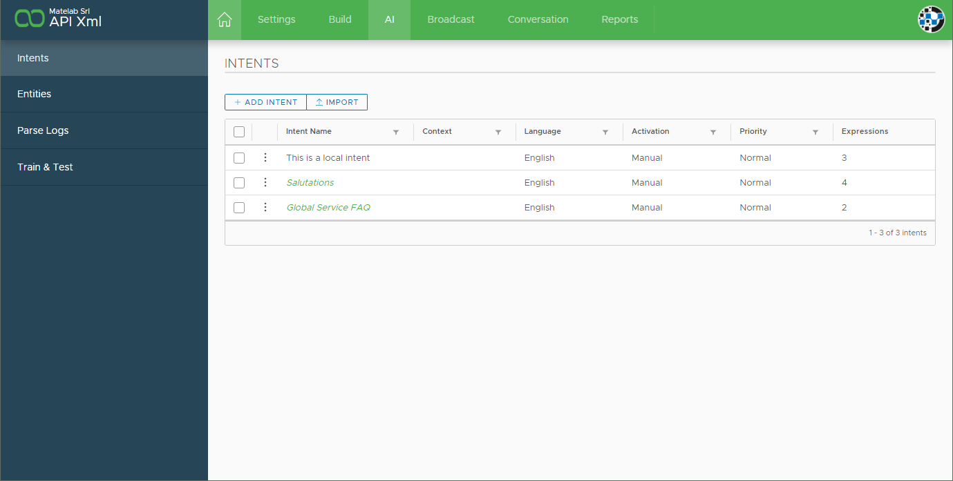 By enabling the NLP Master package it becomes possible for your MyLINK Connect account to share Intents among all of your chatbots without repeating them in every instance. Once added to your account, the Master NLP package will automatically create a new master entry in your chatbot list where all your global NLP can be created.