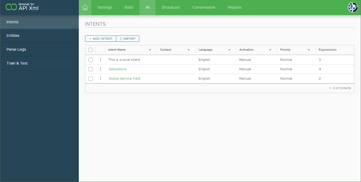 While your intents and expressions are fully defined inside your NLP Master Container instance you still have the ability to configure redirection targets for every single chatbot. In your chatbot AI section you will be able to identify shared Intents by color and style, like in the picture below: