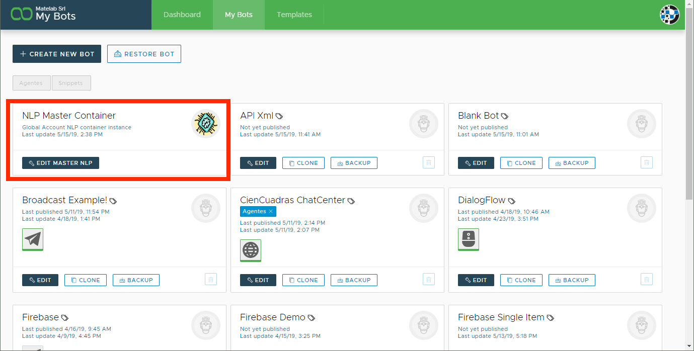 Global NLP Intents and Entities can be referenced in any of your chatbot account. Any update you make on the NLP Master Container will be automatically reflected on every chatbot. The integration with your chatbots will be seamless: you will see the Global NLP Intents and Entities as part of your chatbot with no additional configuration.