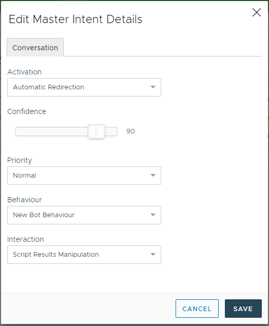 Editing shared Intents will bring up the Master Intet Detail dialog, where you can still choose where the intent is redirecting locally to your chatbot like you would do with a standard one.