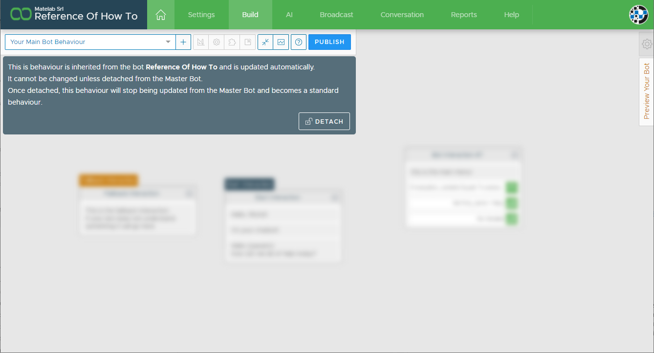 You can change the status of each content by selecting the "Detach" button. If you detach a part of the chatbot from the Master Bot, it will not be automatically updated by the Master Bot and will become local to the child bot.