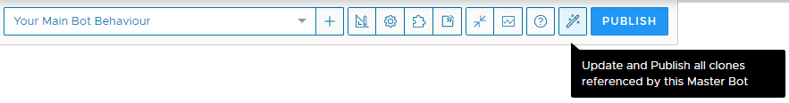 The update and publish button will automatically update all of the referenced clones propagating any change you've made to the master bot. Each child chatbot will also be automatically published to any configured channel.