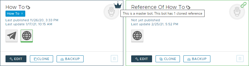 A referenced clone is a chatbot that remains attached in all content and features to its original source. As soon as you create a referenced clone, the original bot will become the "Master Clone" bot and all of the clones will be considered childs of the master. Visually, you'll notice a crown near any Master Bot you have in your account and a link symbol to any child. Hovering over the symbols will let you know how many childs the master has or who is the master of a child.
