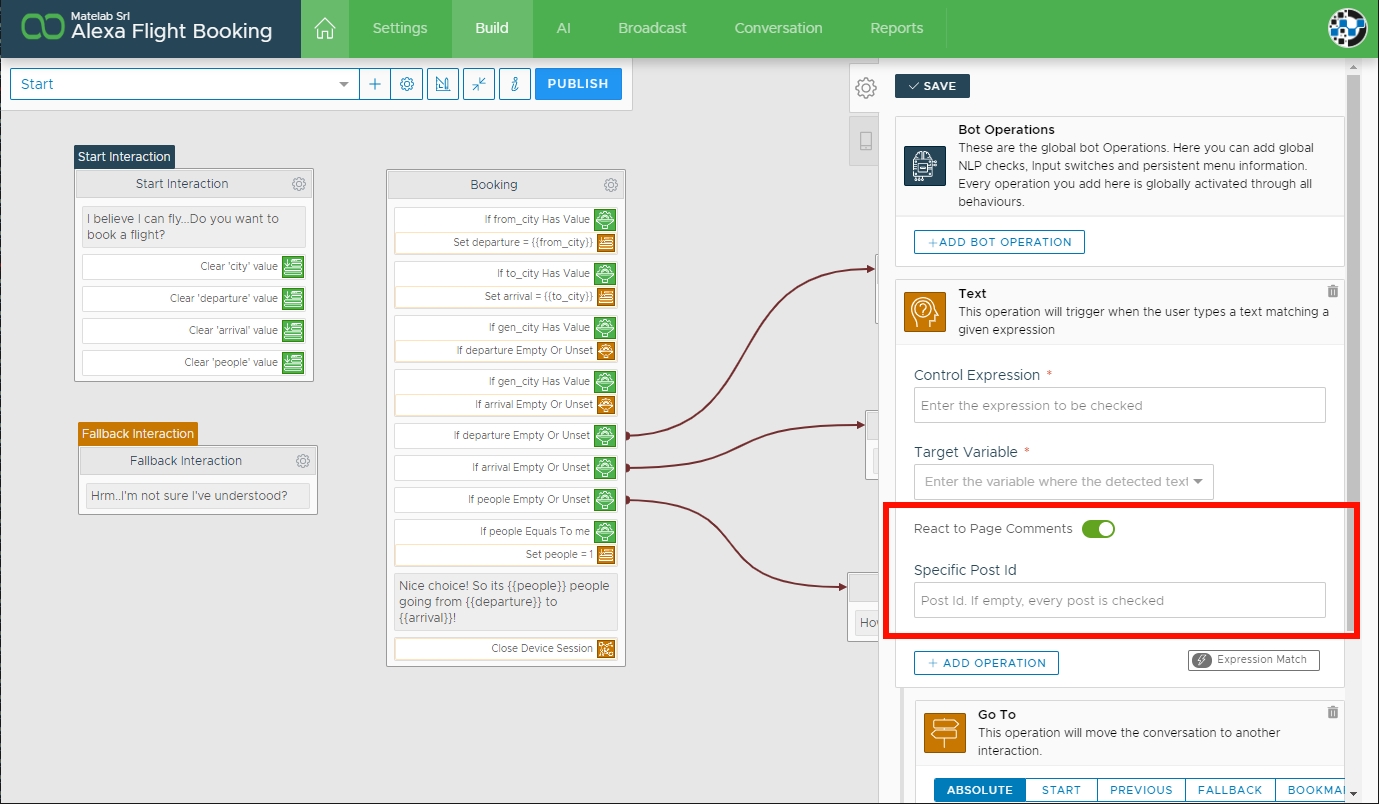 To use feed integration you turn on, on a global bot operation, the React to Page comments flag.