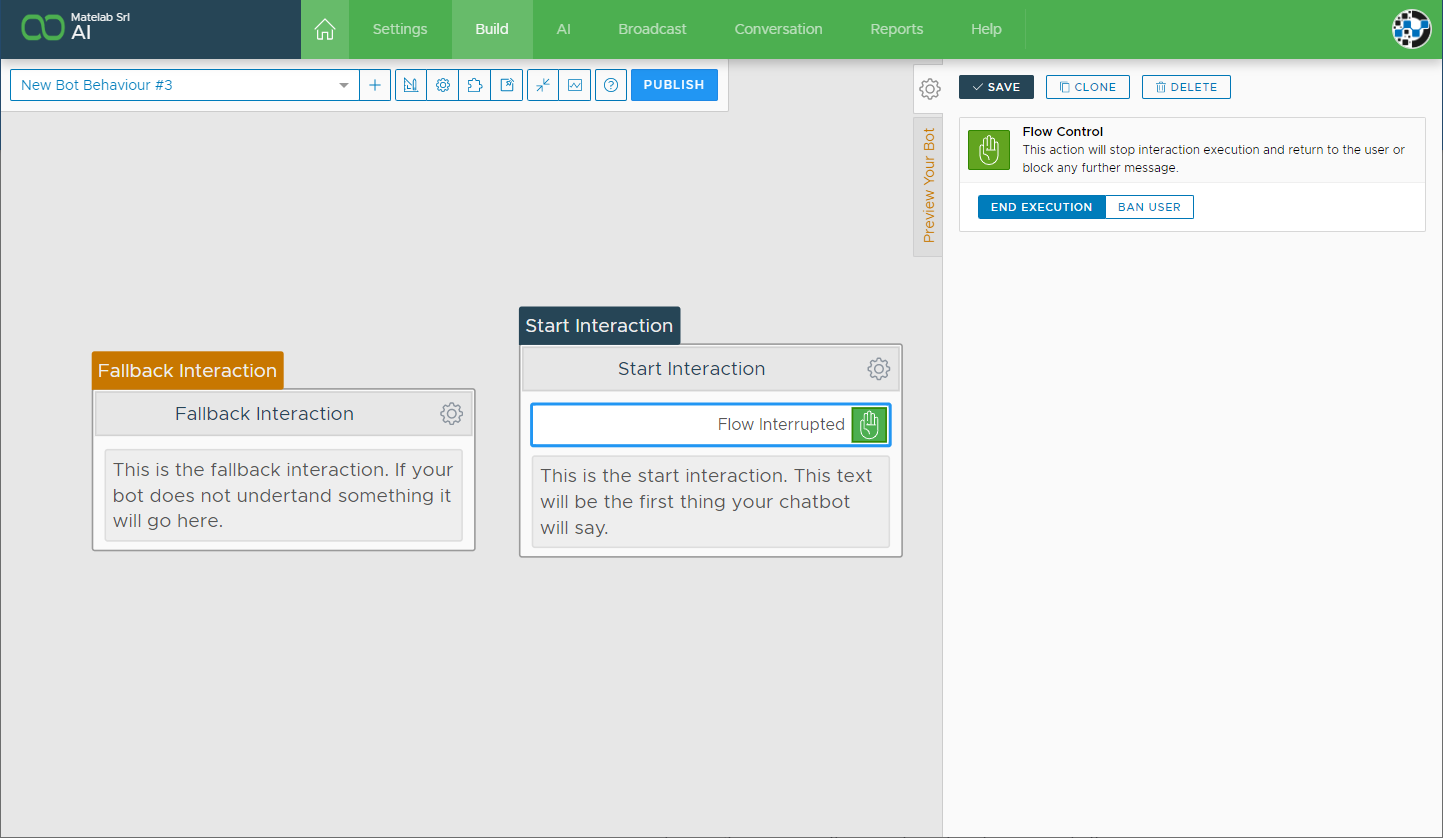 Put a Flow Control Action as the very first action of your start interaction, like in the picture below. This will stop your Xenioo chatbot as soon as it starts. We do not want this later of course but its perfectly fine right now.