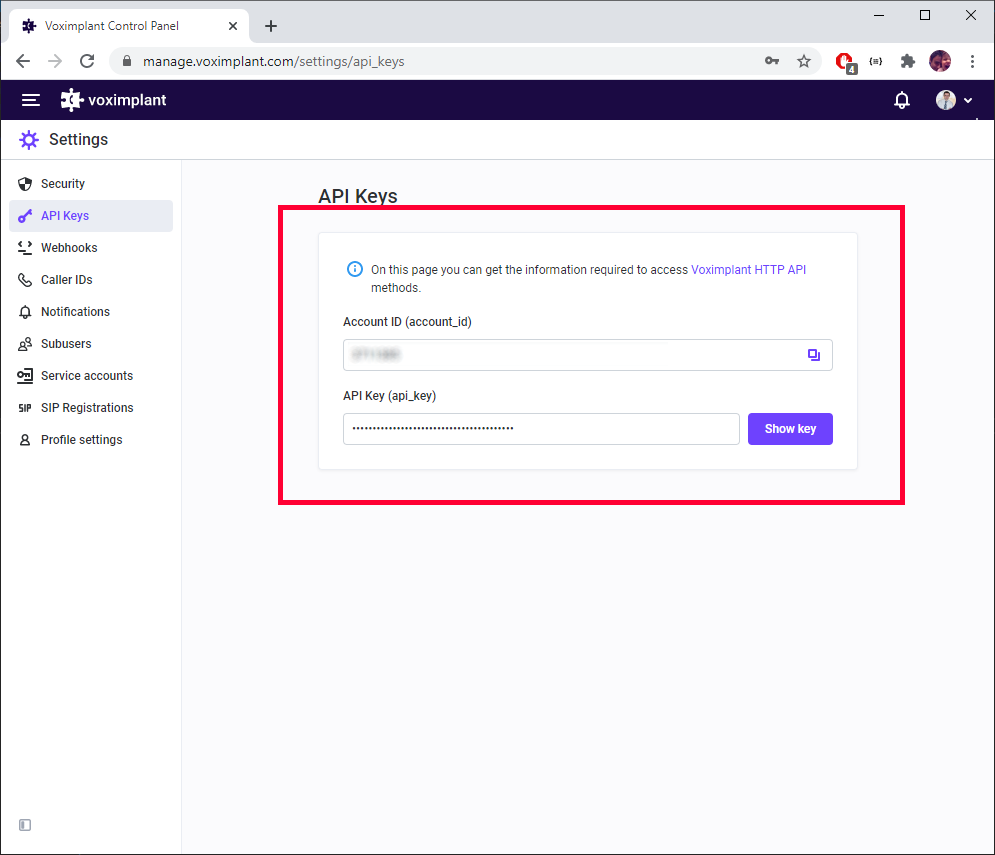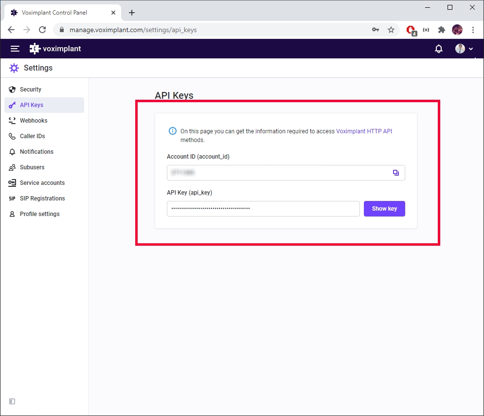 Copy both Account id and API Key into the same fields of your MyLINK Connect Phone Voice Channel dialog
