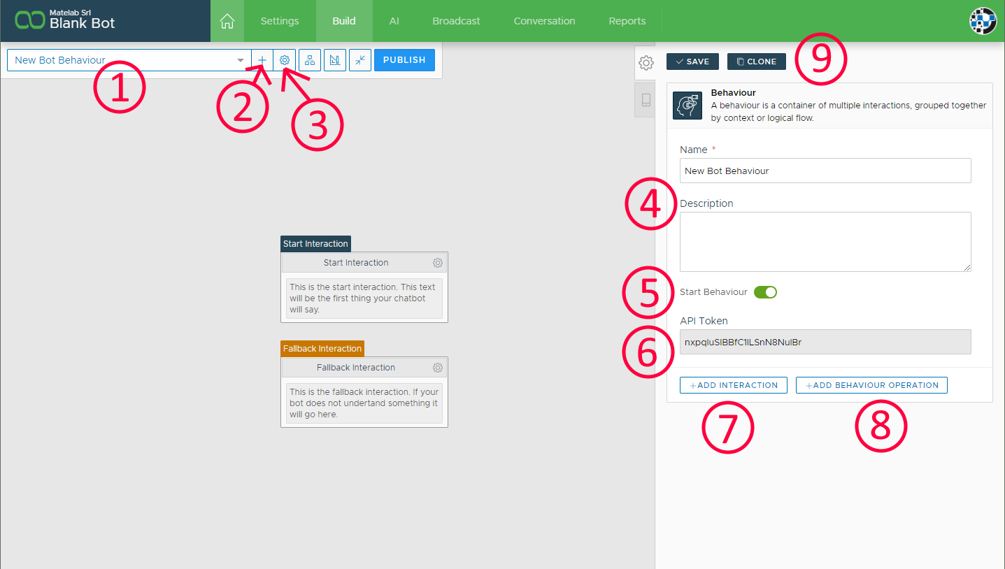 Using this button you can anytime add a new behavior to your chatbot. New behaviors will always be created with the two empty interactions you see.