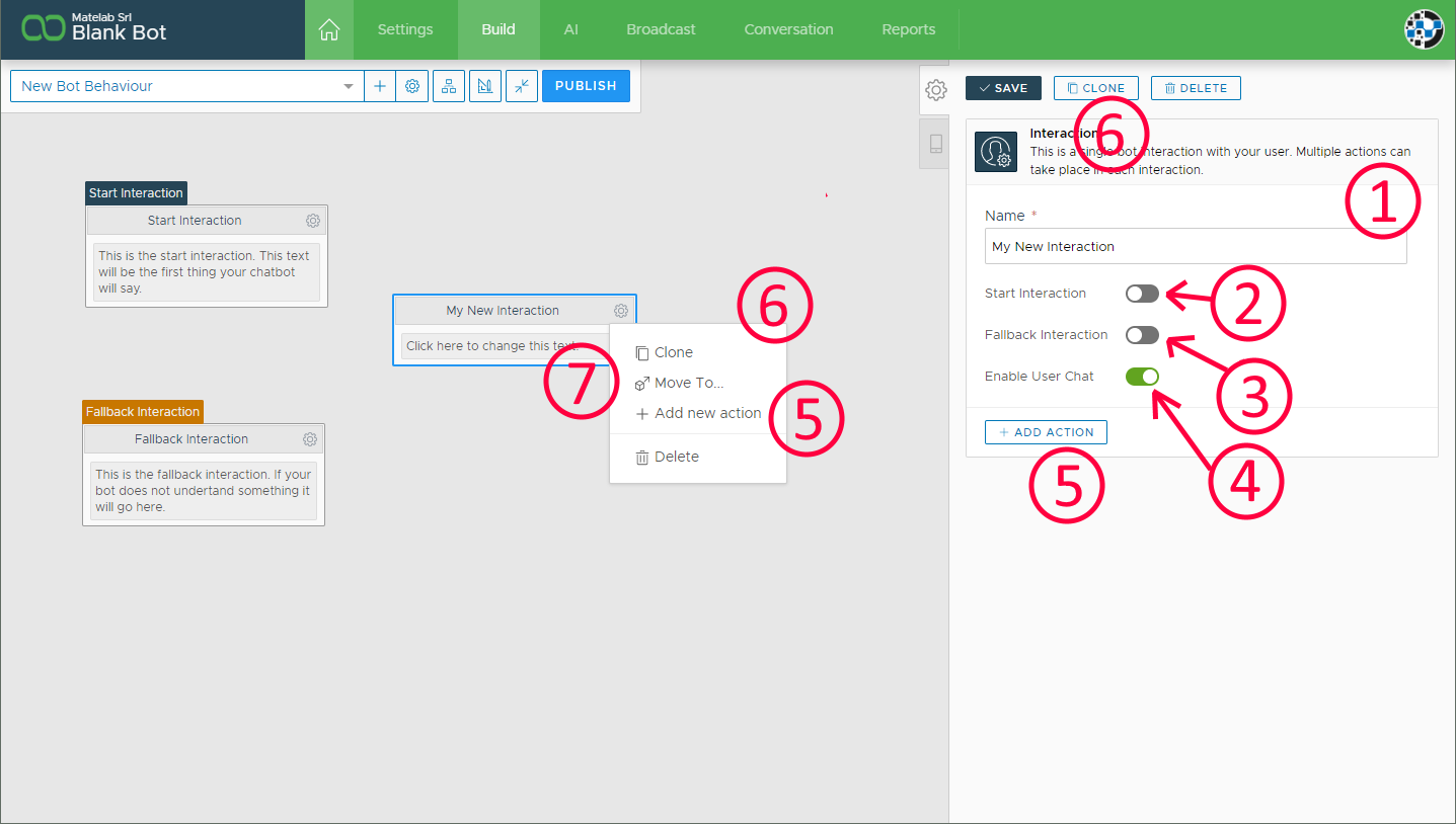 Interactions define the steps of your chatbot behavior and contain information of how exchanges with your users happens. Each interaction will then contain one or more action. Each action defines a minimal unit containing a single step in of a greater interaction. A single action can be, as an example, a speech bubble or a button or an image.