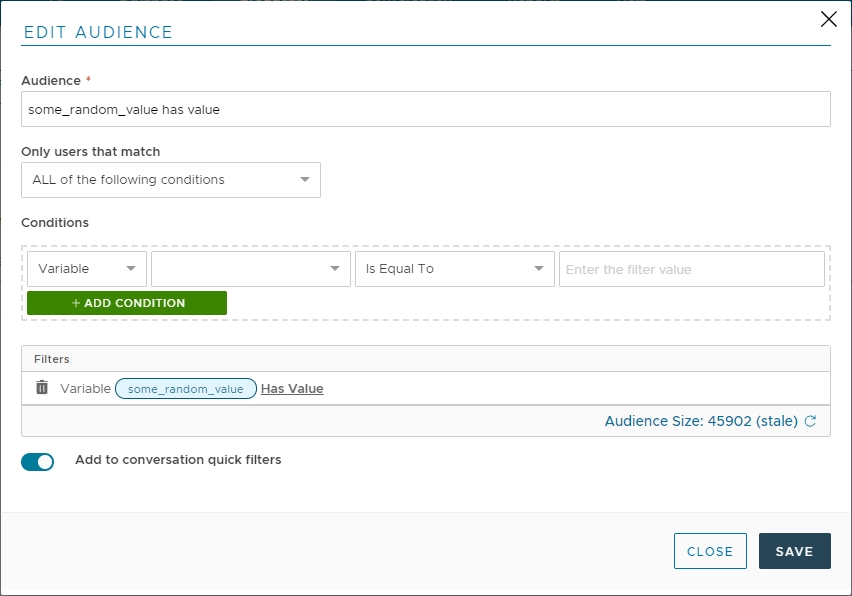 If you enable the "Add to conversation quick filter" toggle, the audience will be also displayed in the custom quick filter menu you can access in the contacts list.