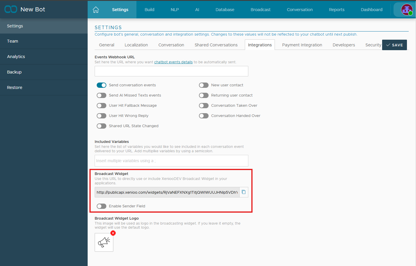 This setting will enable the Sender User Field in the Broadcast Widget view. The Sender User field will be used by the channels that support the parameter to replace the sender currently configured in the [publish ](https://docs.mylinkconnect.com/connect-api/globa-platform-api/bots/publish)section.