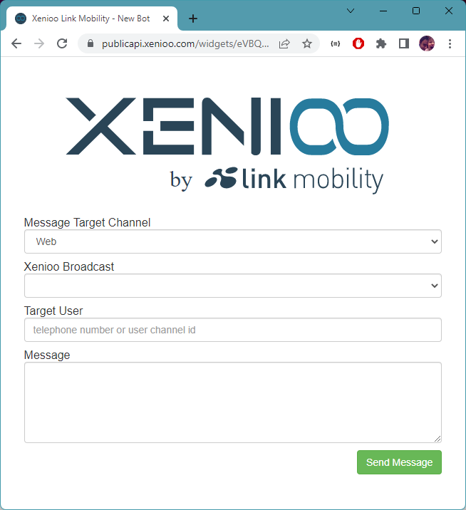 This is the message you wish to send to your target user. In order to fully support this widget, your broadcast must reference, in any part of the flow, a variable named **message\_text**, that will contain the value of the message.\