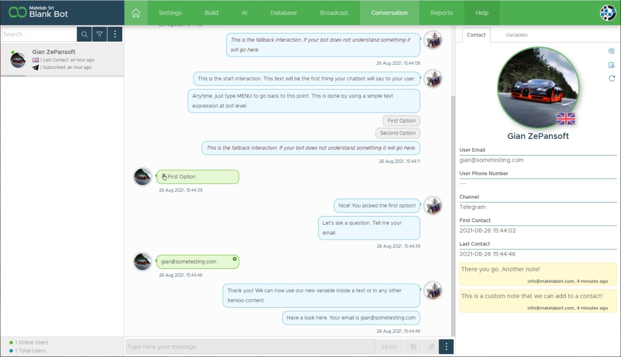Operators accessing the conversation can attach custom notes to a contact. Custom notes are seen only by the operators that can access the conversation and by the account owner. The selected user will not see any kind of information added to notes.