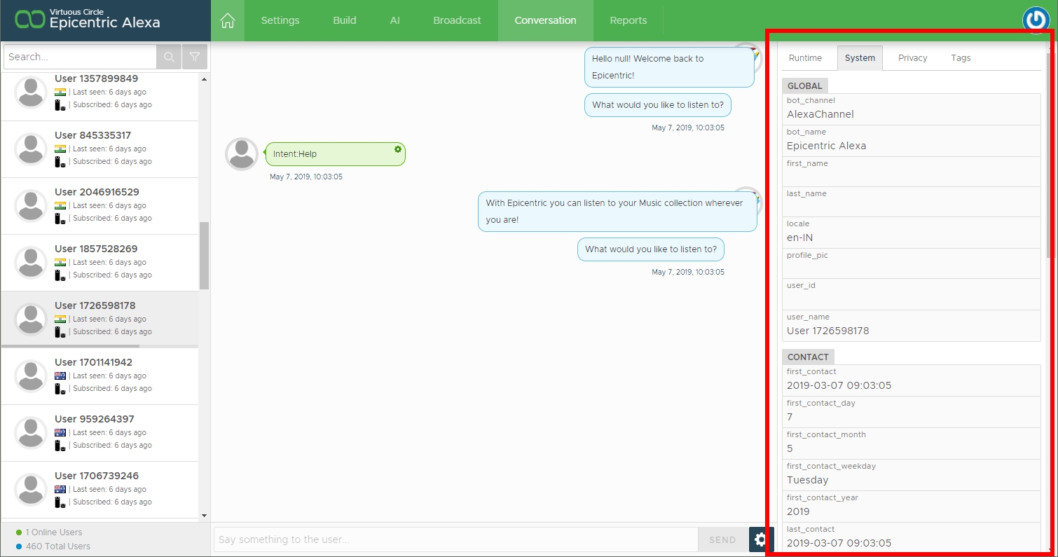 The Variables and Tags panel will display in real-time each and every runtime variable and tag that your chatbot has collected during the conversation with the selected user.