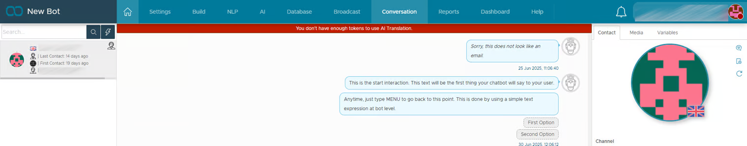 If the user has no remaining AI tokens, an error banner will be displayed within the conversation, and no translation will occur: