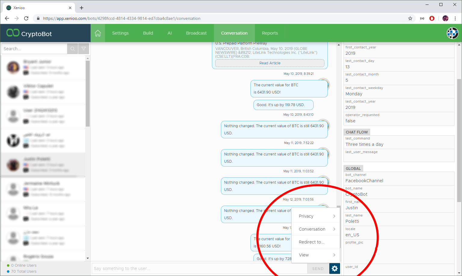 The conversation download command will export the full conversation history of the selected user since the very first contact as a CSV file. An additional CSV file will contain the full list of variables and tags for the whole conversation.