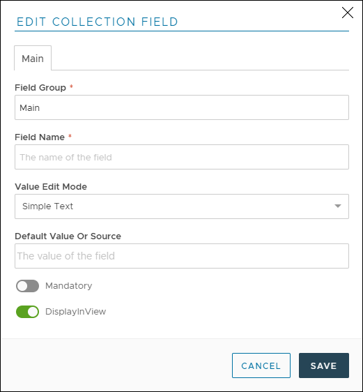 This list contains all of the view fields you wish to define. As stated earlier, collections are not bound to a pre-defined structure like you may find in standard database tables but can contain arbitrary, unstructured data. Still, inserting and viewing records may prove much easier if the general fields you associate with the current collection are defined here. Fields defined in this list are later used by MyLINK Connect to dynamically display collection data and to dynamically build an update/insert form that can be used to manage data directly.